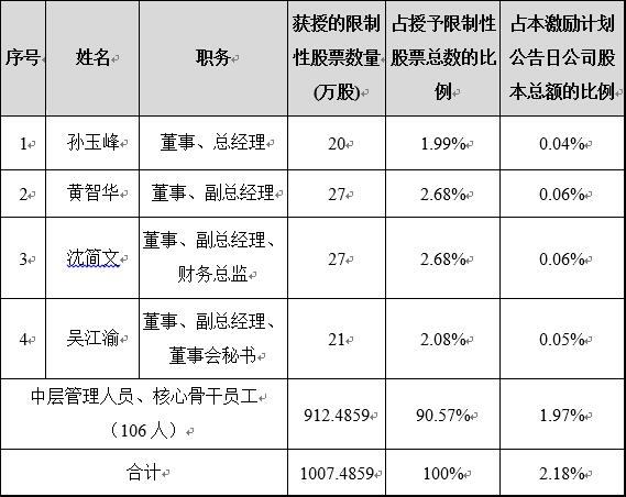 基于對公司未來(lái)發(fā)展的信心,為有效維護廣大股東利益,增強投資者對公司的投資信心,進(jìn)一步建立、健全公司長(cháng)效激勵機制,吸引和留住優(yōu)秀人才,充分調動(dòng)公司及子公司董事、高級管理人員、中層管理人員及核心技術(shù)(業(yè)務(wù))人員的積極性,有效地將股東利益、公司利益和核心團隊個(gè)人利益結合在一起,促進(jìn)公司的長(cháng)遠發(fā)展,經(jīng)公司第三屆董事會(huì )第八次會(huì )議、第三屆監事會(huì )第七次會(huì )議審議,公司推出了2018年限制性股票激勵計劃,現根據《上市公司股權激勵管理辦法》的有關(guān)規定,對激勵對象的名單及職務(wù)進(jìn)行公示如下: